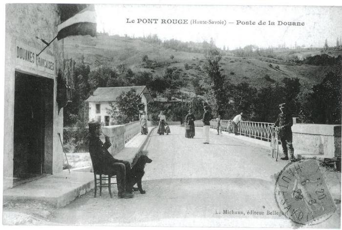 Carte postale en noir et blanc représentant l'ancien poste du Pont Rouge près de Seyssel. Le cliché est vraisemblablement une mise en scène.