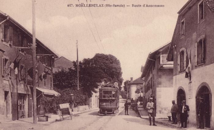 Carte postale sépia du bureau de douanes de Moellesulaz pendant la Première Guerre Mondiale. On aperçoit le tramway qui reliait Genève à Annemasse. Le cliché est animé avec des douaniers.
