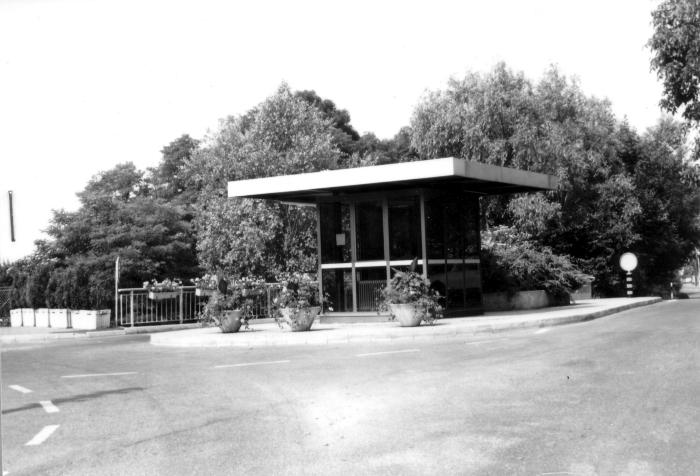 Photographie en noir et blanc de l'aubette de la douane de la Pierre-à-Bochet, à proximité d'Ambilly en 1972. Cette douane dépend de la division d'Annemasse.