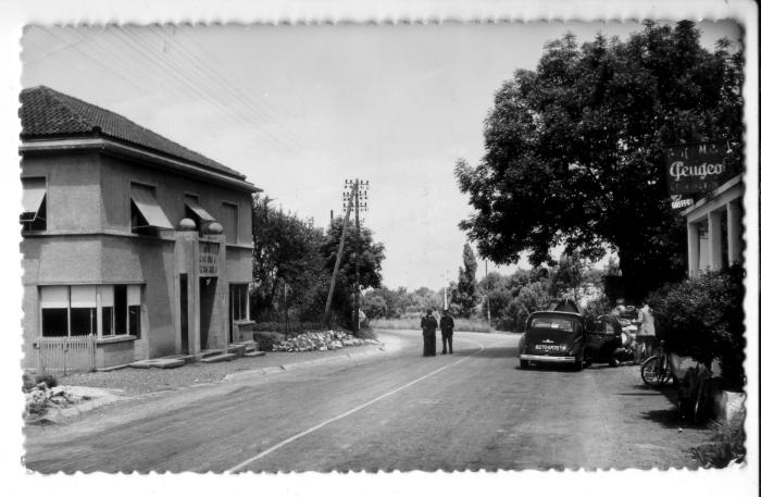 Carte postale en noir et blanc du bureau de douane du Châble, à proximité de Saint-Julien-en-Genevois en 1958. Sur la route un groupe de douaniers. Cette douane dépend de la division de Saint-Julien-en-Genevois.