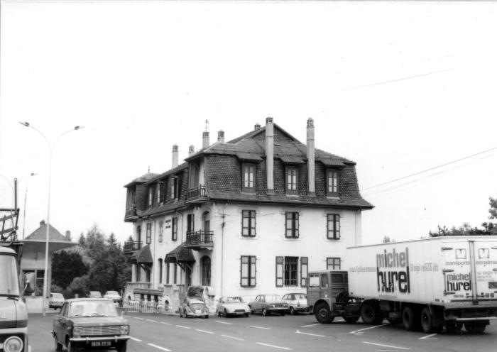 Photographie en noir et blanc de l'aubette centrale de la douane de Perly, à proximité de Saint-Julien-en-Genevois. Cette douane dépend de la division de Saint-Julien-en-Genevois.