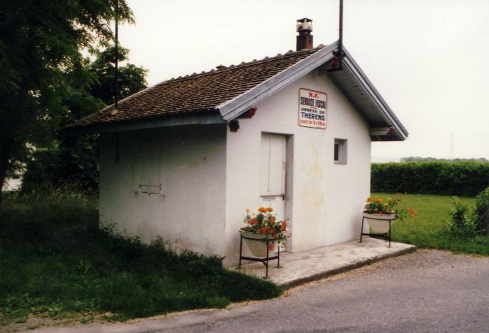 Photographie en couleur de la baraque-abri de la douane de Thérens, à proximité de Saint-Julien-en-Genevois en 1985. Cette douane dépend de la division de Saint-Julien-en-Genevois.
