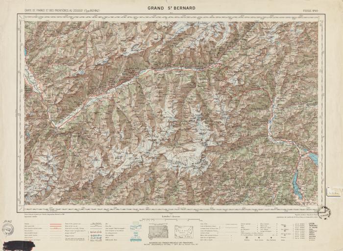 Carte de France et des frontières au 1/200.000e. Type 1912-1942. Grand-Saint-Bernard, feuille n°49 / Dressé, dessiné et publié par l'I.G.N. en 1949. - 550x750. - 1/200.000e. - 1 carte, papier, noir et blanc