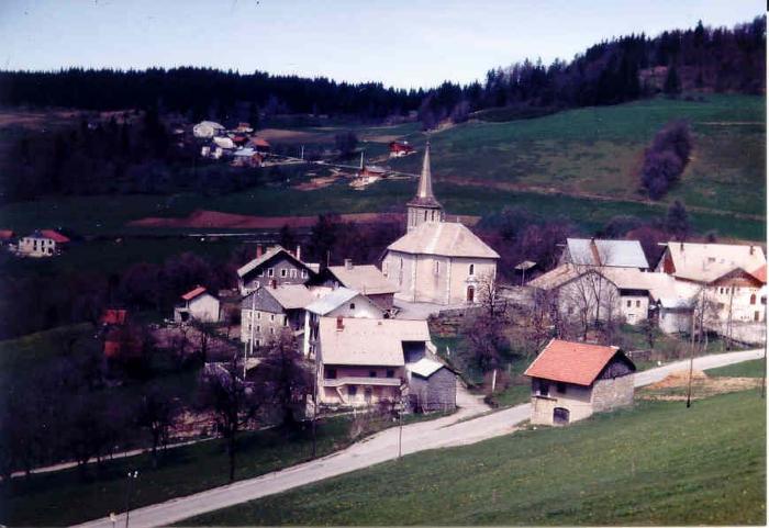 Carte postale, en couleurs, représentant la commune de Bogève en printemps. Il s'agit d'une vue permettant d'apercevoir le chef-lieu et les champs aux alentours depuis la route.