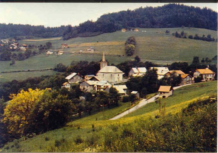 Carte postale, en couleurs, représentant la commune de Bogève en printemps. Il s'agit d'une vue permettant d'apercevoir le chef-lieu et les champs aux alentours depuis la route ainsi que les forsythias en fleurs.