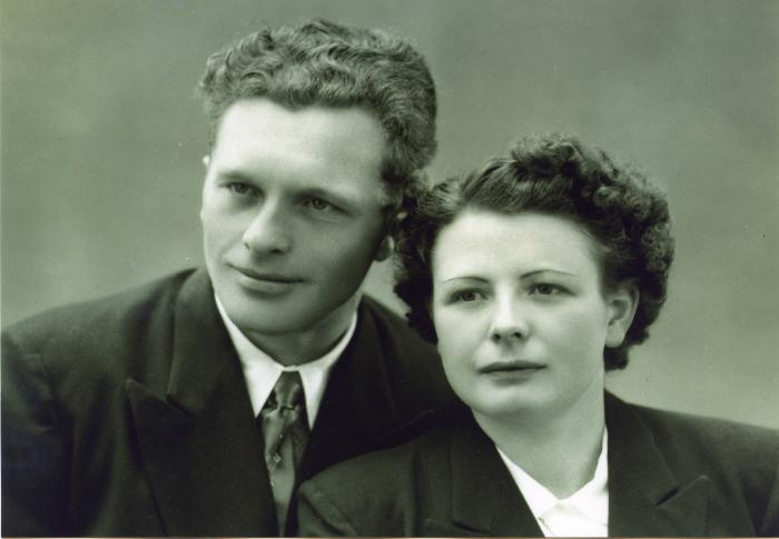 Photographie de mariage en noir et blanc prise le 5 avril 1951 de Albert « tailleur » CHARDON (o 1923) et de Madeleine « Fafois » BAUD GRASSET(1928-2002).