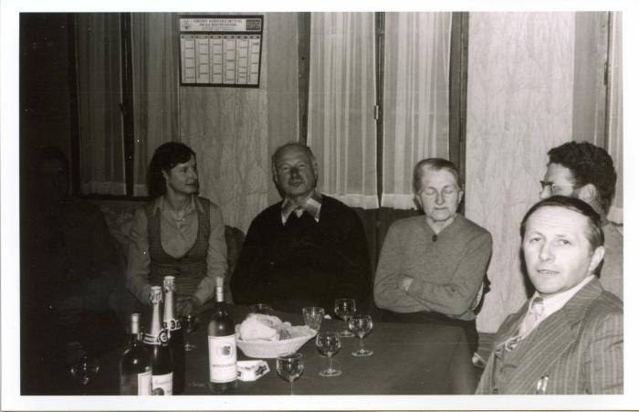 Photographie en noir et blanc de Liliane DUCROT, Anselme, Marie-Louise et Michel NICOUD, et Raymond BOUVIER autour d'une table buvant un verre... ou deux !
