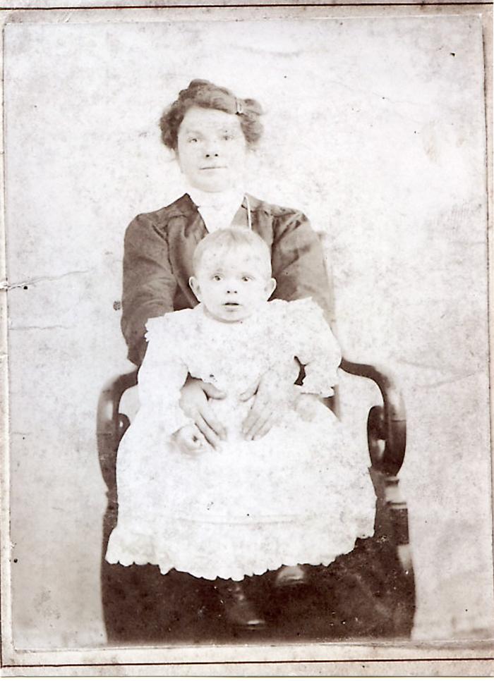 Photographie en noir et blanc de Louise PINGET (née MONGE) et Marcel PINGET sur ses genoux, de Bogève.