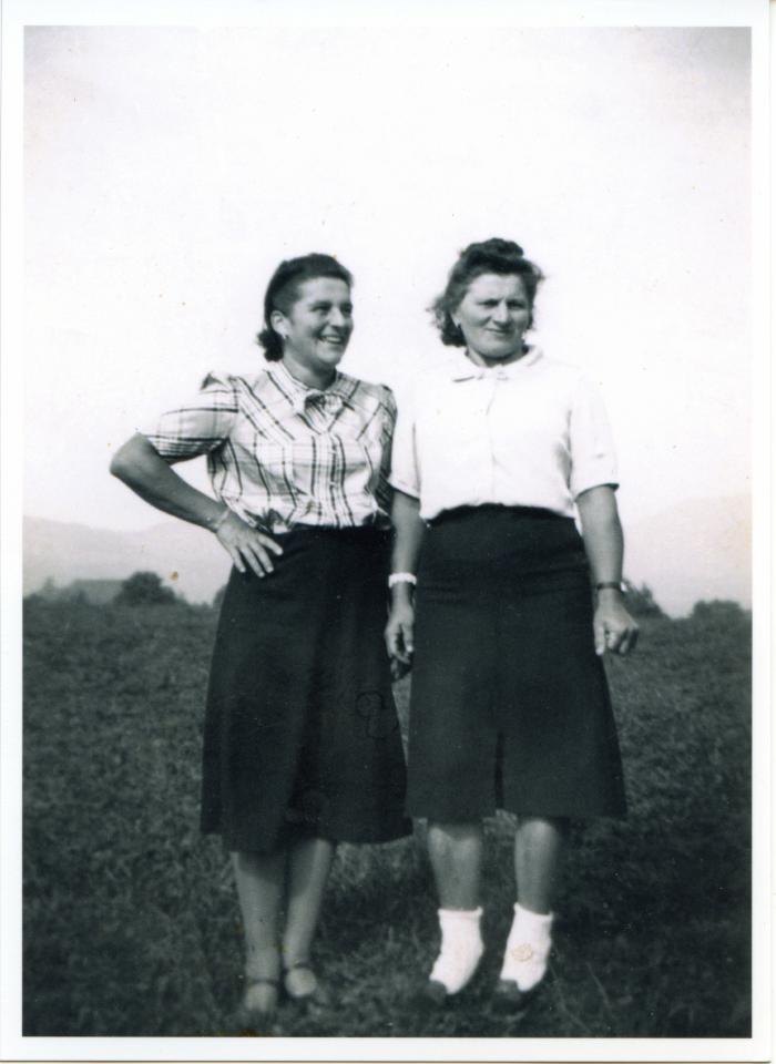 Photographie en noir et blanc prise le 6 juin 1938. Portrait en pied de Aline et Marie « Bourré » BOUVIER de Bogève.