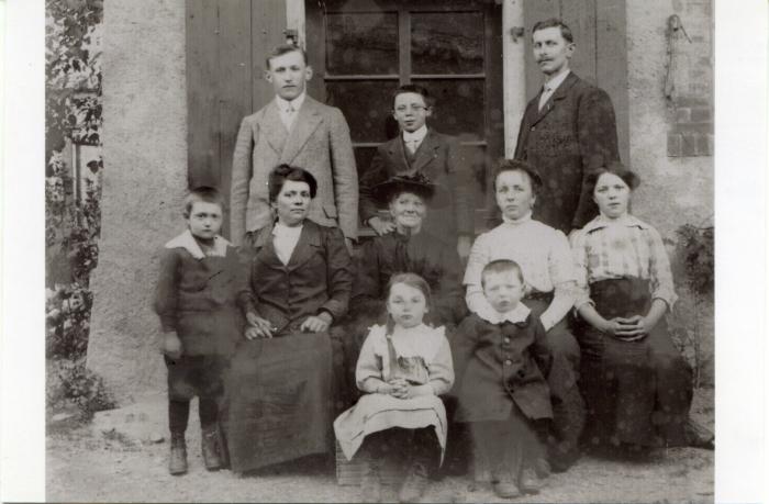 Photographie en noir et blanc de la famille BOVET-FOREL-CHARDON de Bogève. Derrière au centre : Léon BOVET ; Milieu : ? - ? - XXX FOREL, Octavie CHARDON - ? ; Devant : Henriette et Robert CHARDON.