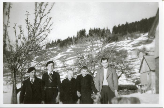 Photographie en noir et blanc de gens de Bogève à La Mouille dont Fernand PINGET qui est la deuxième personne à gauche. Ils posent dans un paysage de neige.