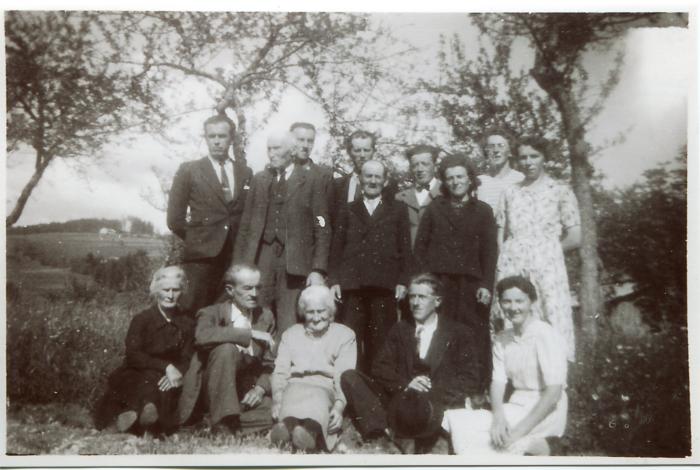 Derrière : Gilbert « Polite » PINGET, François et Paul GRILLET, Louis PINGET, Lucien, Robert et Joséphine CHARDON, Yvonne BRON GRILLET, Célestine GRILLET ;