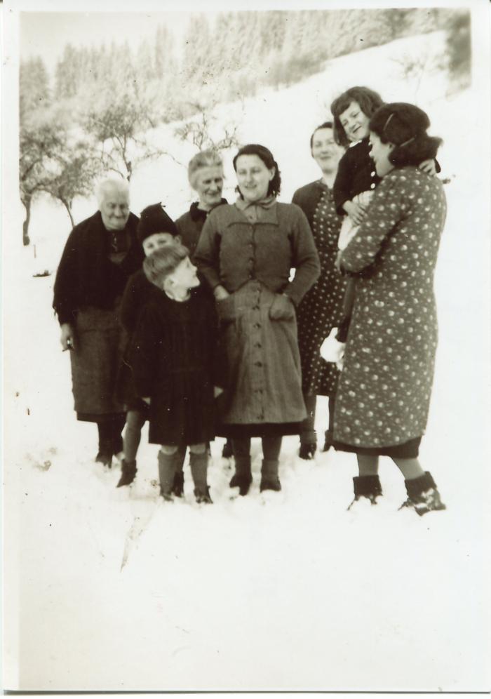 Photographie en noir et blanc de gens de Bogève à La Mouille dans un paysage de neige : Marie Eugénie GRILLET, Thérèse PINGET, Marie et Marthe GRILLET, Joséphine CHARDON.