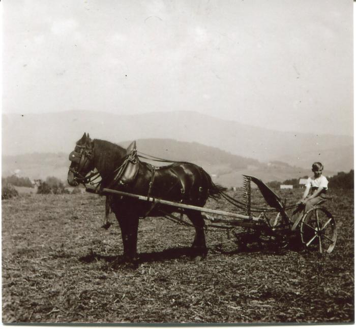 Photographie en noir et blanc de Léon PINGET sur une faucheuse attelé à un cheval qui porte des oeillères.