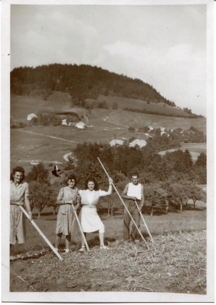 Photographie en noir et blanc de Louise, Adeline et Louis BAUD LAVIGNE au champ. Ils tiennent tous des outils à la main dont un râteau.