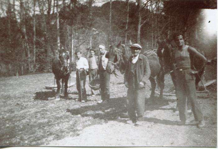 Photographie en noir et blanc d'un groupe d'hommes qui font les foins en 1939, avec des chevaux portant des oeillères : ?, Amable GRILLET, ?, Lucien CHARDON, ?.