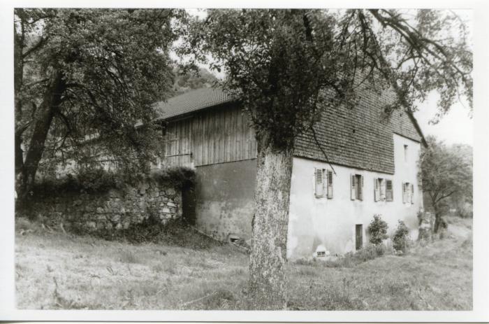Photographie en noir et blanc d'une ferme aux Lavouëts à Bogève en 1979. Le pignon est composée de tavaillons, la façade latérale côté grange est revêtue de bardages.