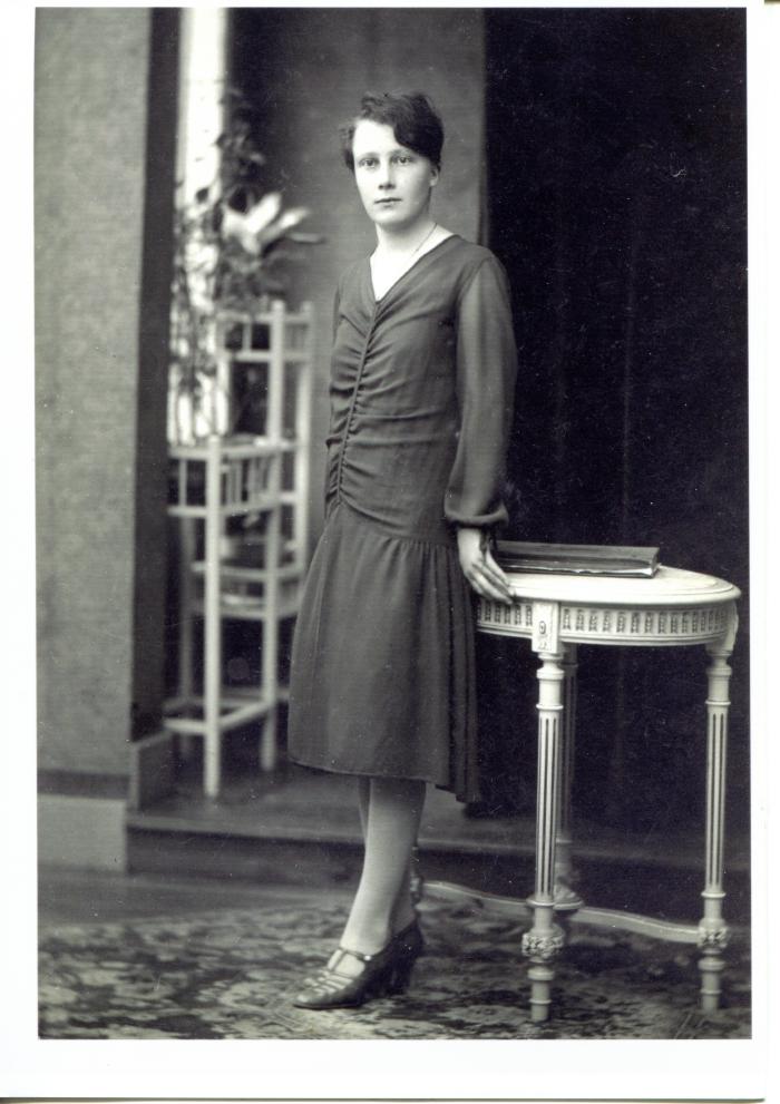 Portrait en noir et blanc, en pied, de Marguerite GAVARD MOLLIARD (La Tour 1907-2007). La photographie a été prise en décembre 1930.