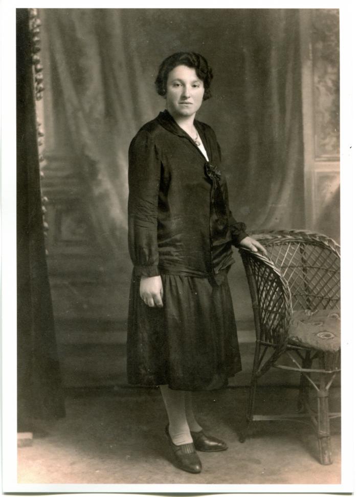 Portrait en noir et blanc, en pied, d'une jeune femme de Bogève.
