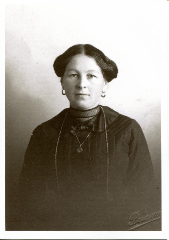 Portrait en noir et blanc, en buste, d'une jeune femme de Bogève. Elle porte des boucles d'oreille en forme d'anneaux et des bijoux autour du cou.