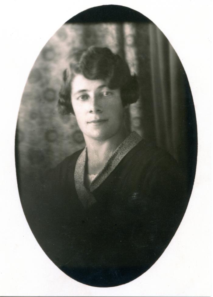 Portrait ovale en noir et blanc, en buste, d'une jeune femme de Bogève.