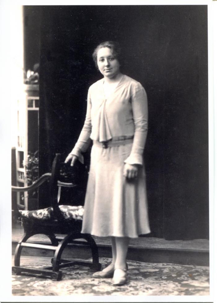 Portrait en noir et blanc, en pied, d'une jeune femme de Bogève. Elle porte une robe de couleur claire.