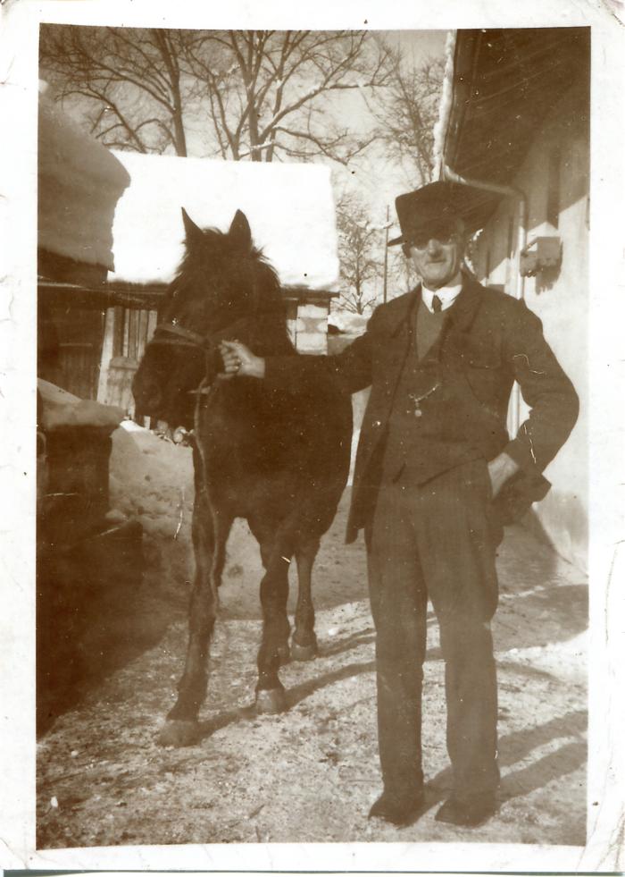 Portrait en noir et blanc , en pied, de Joseph « Cordani » BAUD LAVIGNE (1875-1944) au Bosson. Il porte un chapeau et il tient un cheval par la bride. Les toits sont recouverts de neige.