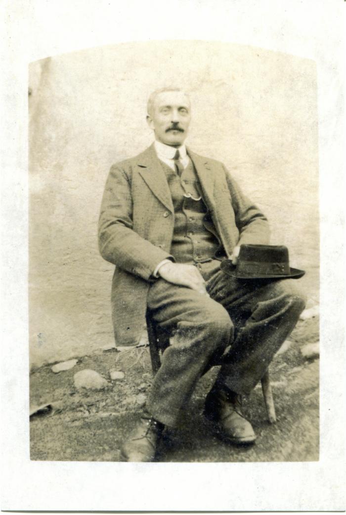 Portrait en noir et blanc de Joseph « Cordani » BAUD LAVIGNE (1875-1944). Il est assis et il tient un chapeau.