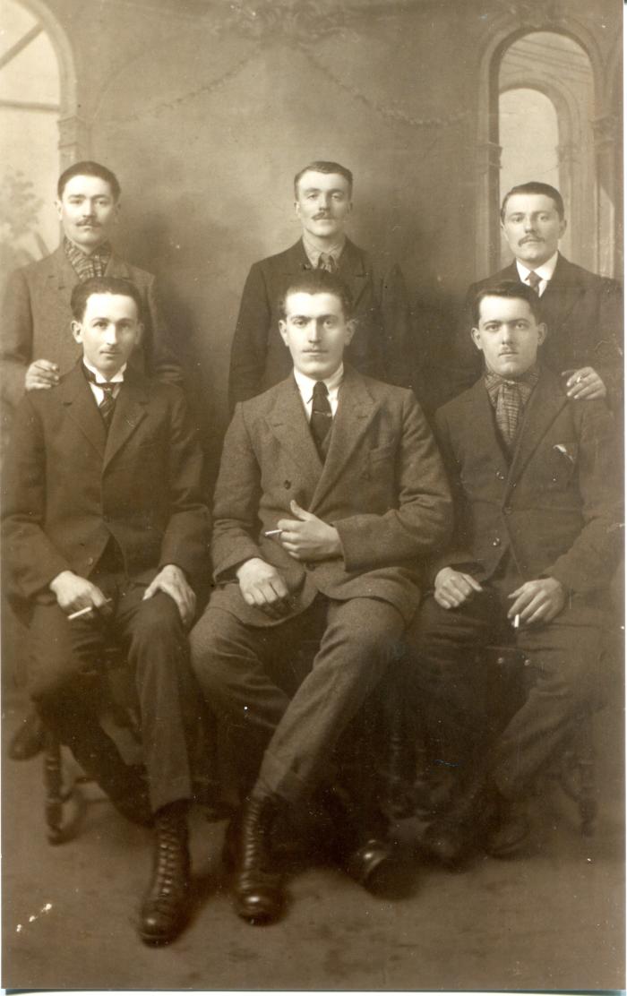 Portrait en noir et blanc d'hommes de Bogève. Debout : Raoul BOVET, André GAVARD, Marcel GAVARD ; Assis : Félicien BAUD GRASSET, Eloi PINGET, Emile GAVARD.