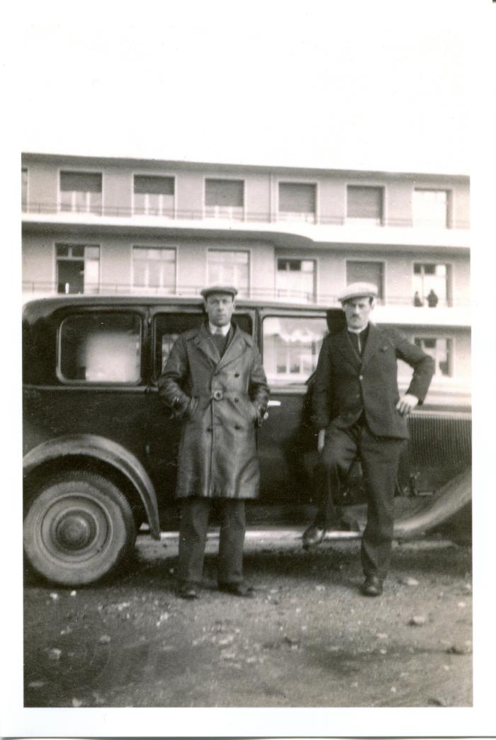 Portrait en noir et blanc de deux hommes portant une casquette, près d'une voiture.