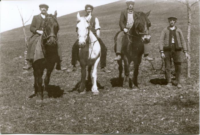Portrait en noir et blanc de Louis, Robert et Alphonse CHARDON. Sur les quatre personnes à l'image, trois sont sur des chevaux. Tous portent une casquette. La première personne à gauche n'est pas identifiée. Les trois suivants sont respectivement Louis, Robert et Alphonse CHARDON.