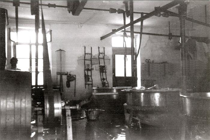 Photographie noir et blanc de la fruitière de Bogève. On y voit trois cuves en cuivre probablement.