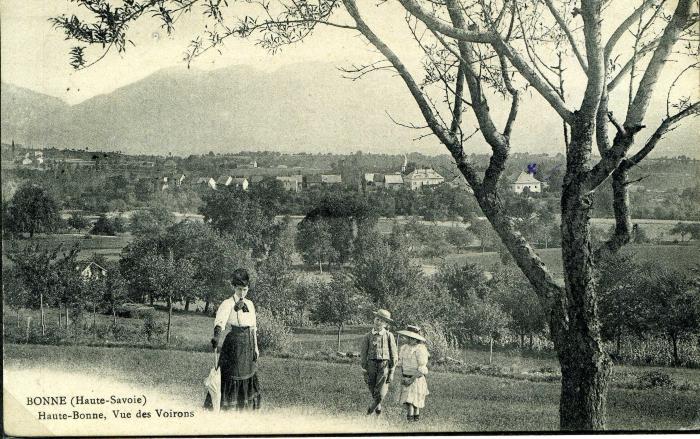 Carte postale en noir et blanc représentant une vue des Voirons depuis Bonne. La vue est animée avec une dame et deux enfants, certainement en villégiature à Bonne.