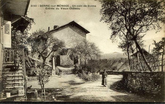 Carte postale sépia représentant un coin des hauts de Bonne, à proximité du vieux château.