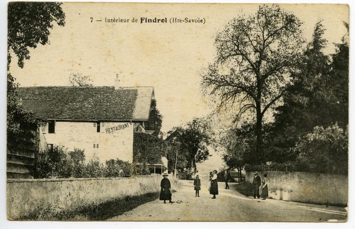 Carte postale d'une rue de Findrol, en Haute-Savoie, bordée par un restaurant à gauche.
