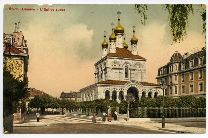 Carte postale colorisée de l'église orthodoxe de Genève, de plan carré avec décor d'arcades et de pilastres. Cinq lanternes en forme de bulbes dorés et surmontés de croix. Carte expédiée en 1920.