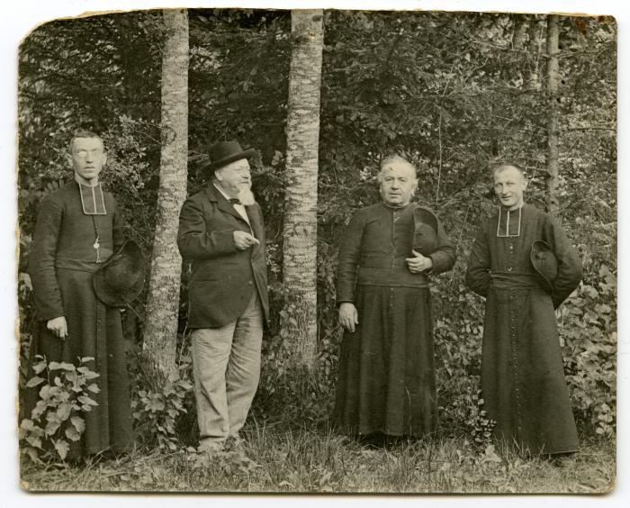 Photographie de quatre personnes dans un parc dont trois religieux qui portent une soutane et tiennent un chapeau.