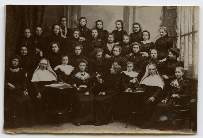 Photographie d'un groupe de jeunes femmes encadrées par deux religieuses.