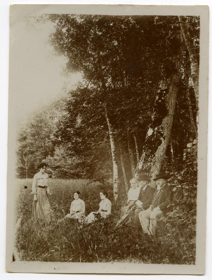 Photographie d'un groupe de personnes dans le parc Chez Bosson à Fillinges, chez le docteur Adrien Bonnefoy. Il pourrait s'agir de la famille Bonnefoy avec des amis ou de la famille. La première et la troisième jeunes filles, à gauche, sont les sœurs du docteur Adrien Bonnefoy, Julie debout et Louise assise. La femme assise, leur mère ? Et l'homme assis à droite leur père?. Cette partie du parc se situe le long du Foron dans le pré au sud de la maison.