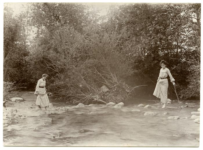 Photographie de Louise et Julie Bonnefoy, sœurs du docteur Adrien Bonnefoy, les pieds dans un cours d'eau.