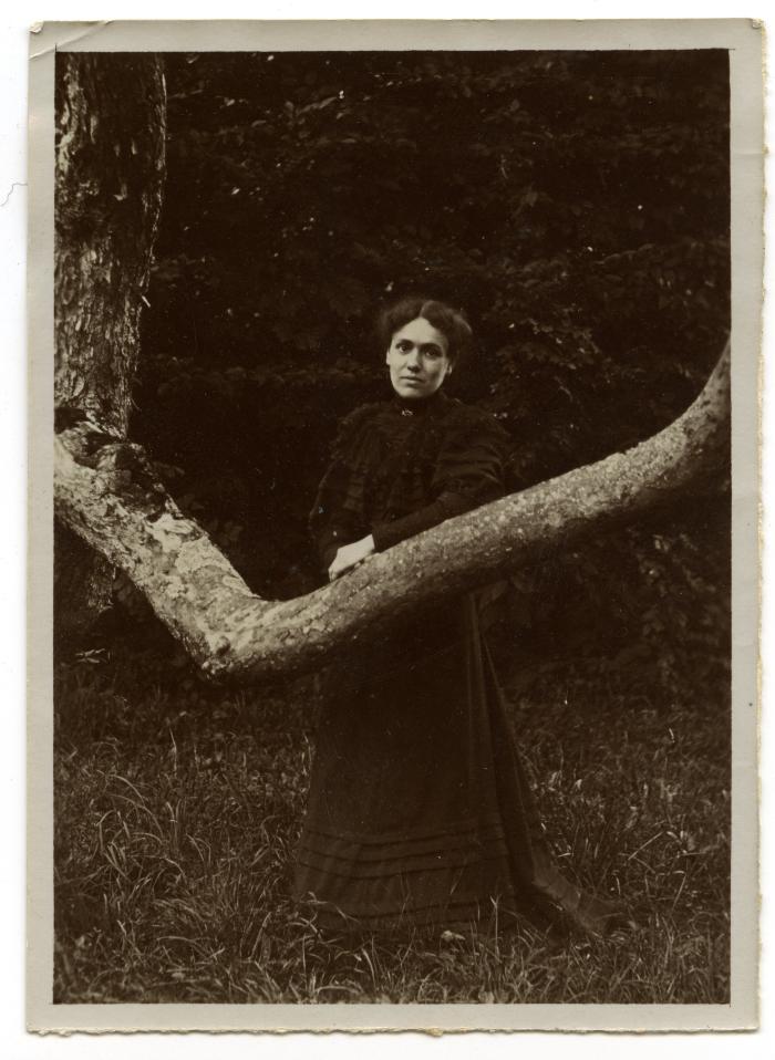 Photographie de Louise Bonnefoy vêtue de sombre, dans le parc, Chez Bosson à Fillinges, près de l'arbre à la grosse branche horizontale.