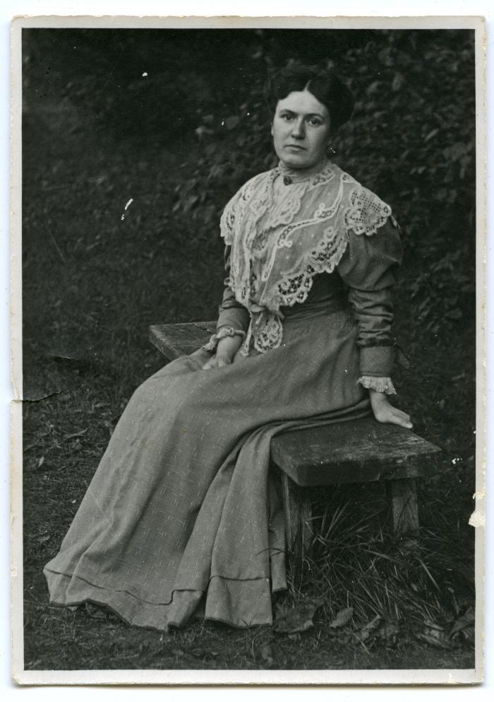 Portrait d'une femme assise sur un banc, dans le parc Chez Bosson à Fillinges, chez le docteur Adrien Bonnefoy. Elle porte un châle brodé, sur les épaules.