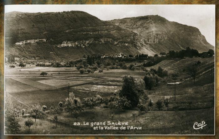 Carte postale en noir et blanc représentant le Salève en arrière-plan, au centre, une plaine agricoles, bordée par une colline où se dressent quelques maisons gaillardines.