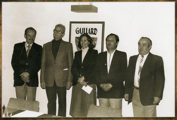 Photographie en noir et blanc représentant Mme Renée MAGNIN le jour de son élection à la Mairie de Gaillard, entourée d'une partie de l'équipe municipale.