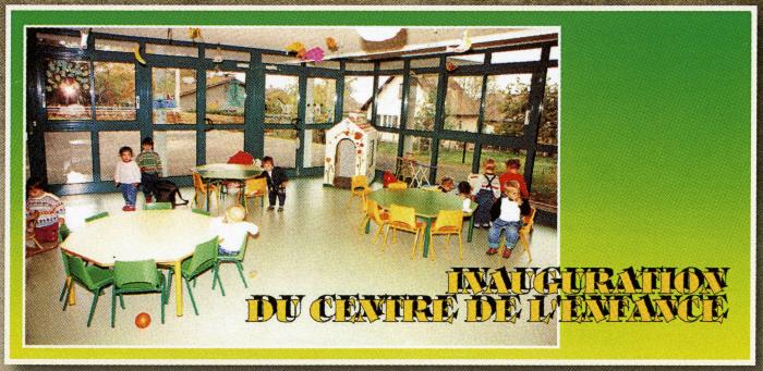 Carton d'inauguration du centre de l'enfance de Gaillard en 1991. On voit sur la photo les nouveaux locaux, avec deux tables rondes entourées de chaises, ainsi que des enfants.