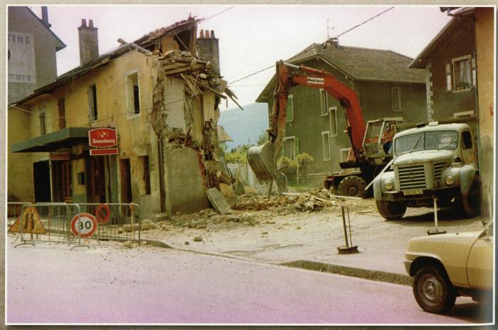 Photographie en couleur représentant la démolition du café des Chasseurs de Gaillard, rue de Moillesulaz.