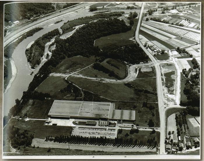 "Photographie aérienne en noir et blanc représentant le Parc d'Activité de la Chatelaine, avec au premier plan, les laboratoires Aspro. A gauche, l'Arve se sépare légèrement de part et d'autre de "l'ile aux castors".