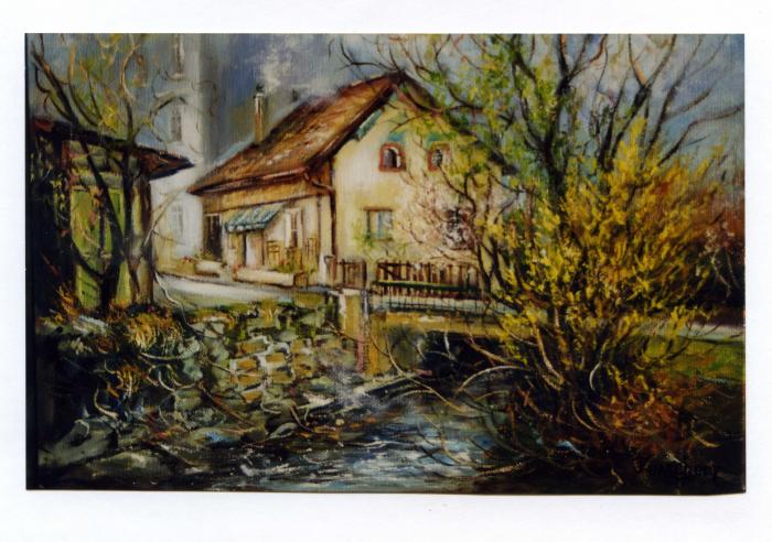 Photographie en couleur de la peinture de M. Auguste PATERLINI, peintre de Gaillard, qui a représenté sa maison à partir d'une photographie.