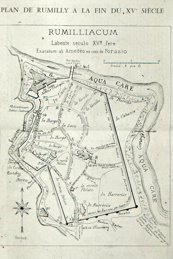 Rumilly, plan de la ville à la fin du XVème siècle. Milliaire