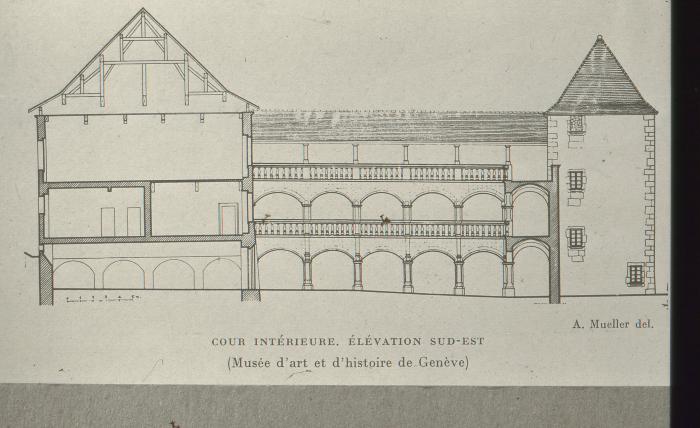 Coupe intérieure et élévation sud-est du château de Clermont. A. MUELLER Musée d'Art et d'Histoire de Genève